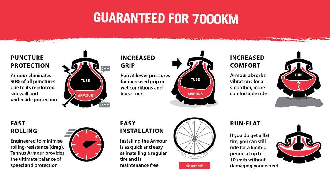 Sitting between your tire and inner tube, the Tannus Armour provides 15mm of puncture protection on the top, as well as 2mm of sidewall protection from sharp objects and rocks.